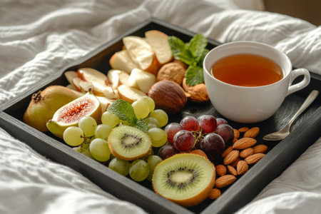 A beautifully arranged breakfast board features vibrant fruits like apples, kiwis, and grapes alongside a selection of nuts, all complemented by a warm cup of tea on a soft bed
