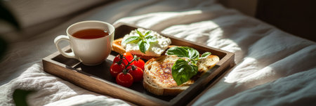 Delicious breakfast featuring creative toasts topped with eggs and fresh tomatoes, paired with a warm cup of tea, all arranged on a wooden tray in a soft, cozy bedroom, banner