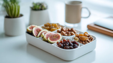 A healthy snack box with figs, nuts, and dried fruits is neatly arranged on a white table.