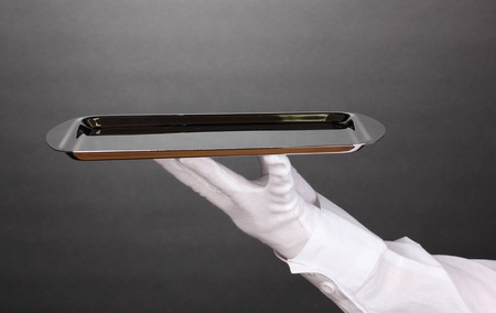 Hand in glove holding silver tray on grey background