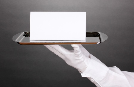 Hand in glove holding silver tray with blank card on grey background