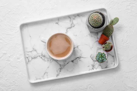 Tray with cup of coffee and houseplants on white background