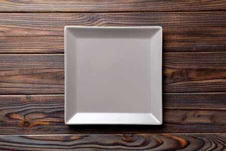 Top view of empty square plate on wooden background. Empty space for your design.