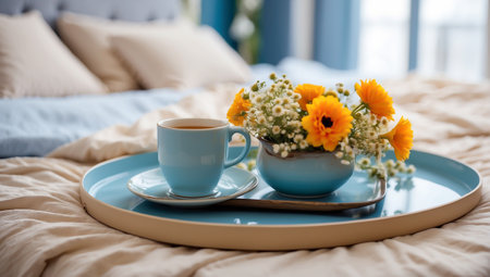 Tray with a blue cup of coffee, vase with beautiful flowers on the bed in the room