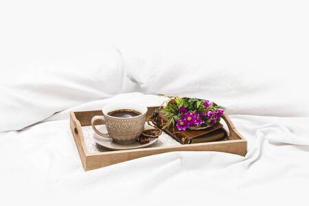 Fresh morning coffee with wrapped flowers on a board on a bed sheet