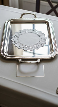 silver tray on the table in a restaurant, closeup of photo