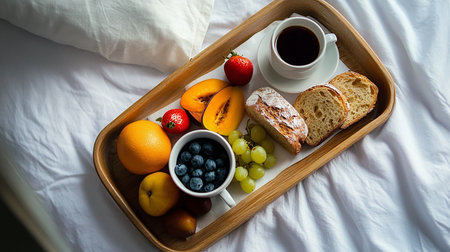 Breakfast in bed with coffee, croissants and fruits.
