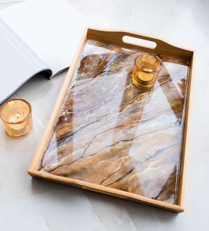 Handmade wood serving tray decorated with marble effect. Epoxy resin art decor. Natural colors like brown. gold, black, beige. Background for DIY master class. Fluid art or acrylic decorative tray