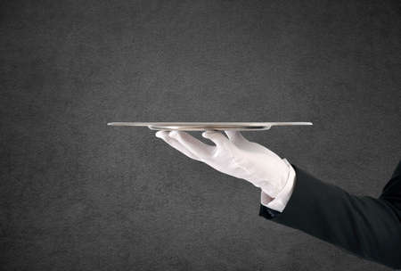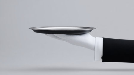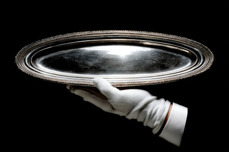 A sophisticated image featuring a gloved hand of a butler presenting a shiny silver serving tray, ideal for themes of elegance, service, and luxury in hospitality.
