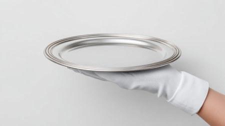 A refined hand wearing a white glove elegantly presents an empty silver serving tray. This image captures the essence of formal dining and hospitality, highlighting professionalism and clean aesthetics.