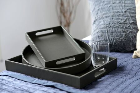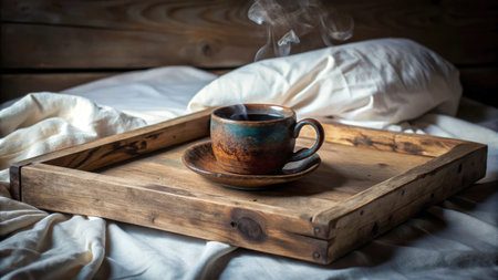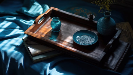 Wooden tray with blue ceramic vase and book on bed. generative ai