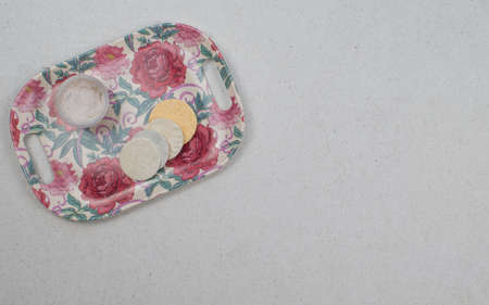 Flatlay cosmetic products on light background, plastic tray with a flower pattern. Beauty set of scrub, sea salt, gel aloe, sponges, cream, shampoo for face and body. Top view beauty flat lay.