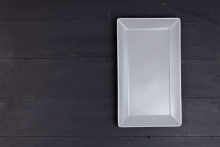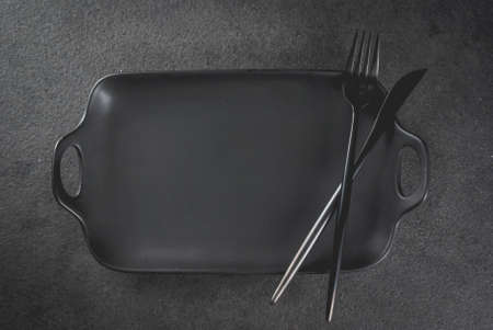 Cooking background. Kitchen, lunch, dinner. Black stone table with a stylish black porcelain plate of rectangular shape, with a fork and knife. Top view copy space