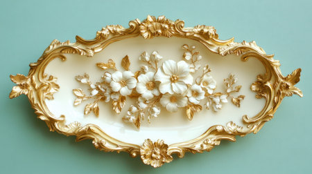 This stunning porcelain platter showcases an elaborate floral design with gold accents, perfect for adding a touch of elegance to any decor setting.