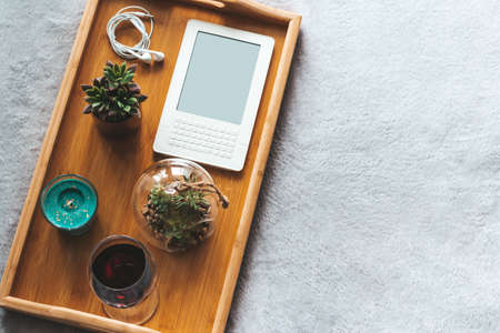 Electronic book, glass of wine, house plants on wooden tray. Reading and relaxing during self isolation at home as preventative measure against virus outbreak. What to do during quarantine concept.