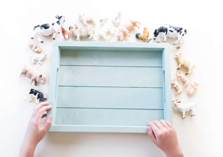 Montessori material farm animals. Education at home. Lesson with children. White background.