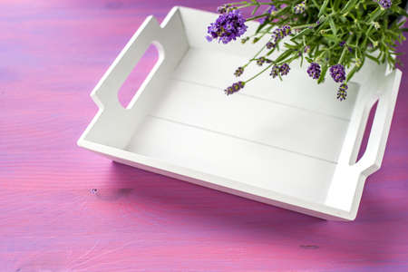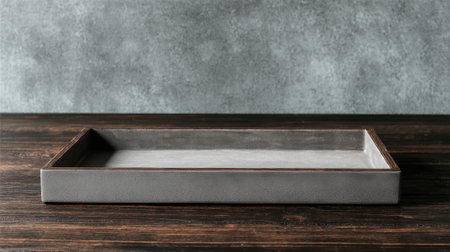 A grey tray sits on a wooden table. The tray is empty and has a simple design. Scene is calm and uncluttered