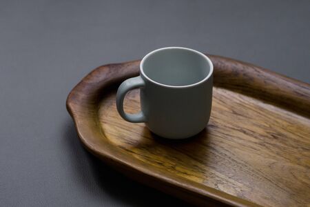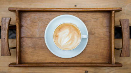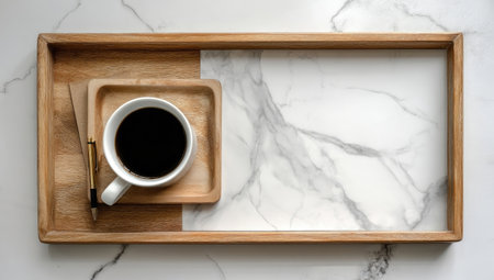 A white coffee cup sits on a small wooden tray, placed inside a larger tray. The trays feature a contrasting design with wood and a marble effect. The composition is viewed from above against a white marble background. This image is suitable for various commercial purposes, including product displays and lifestyle content.