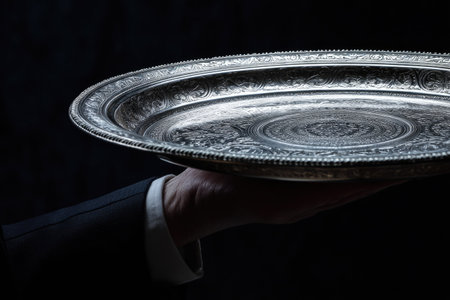 Close-up of a hand in suit presenting ornate silver serving tray against a dark background