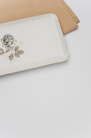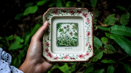 Hand holding antique tray with botanical illustration, featuring delicate floral patterns and soft colors. The image suggests tranquility and vintage aesthetics, suitable for various design projects.