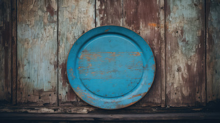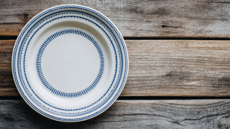 A sophisticated blue patterned plate rests on a weathered wooden table, showcasing a blend of rustic charm and elegant design. Ideal for food presentation and culinary imagery.