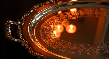 A close-up of an ornate antique silver serving tray resting on a dark surface. The polished metal surface reflects the warm glow of candlelight creating an elegant and romantic atmosphere suitable for luxury dining concepts.