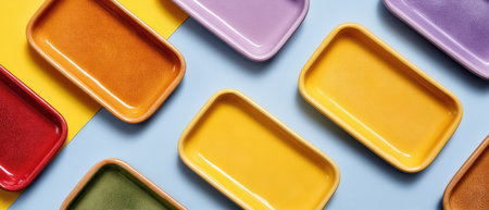 Colorful ceramic tray arrangement sustainable packaging concept with empty trays on pastel background evoking cheerful eco conscious display