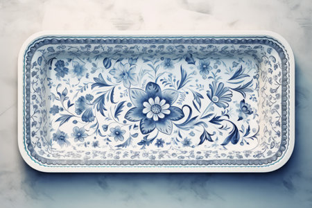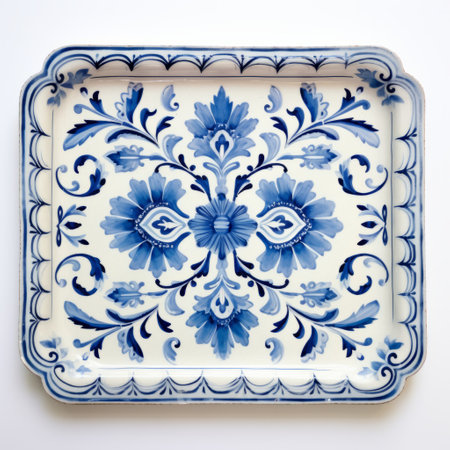 a decorative tray featuring a blue and white color scheme showcases an intricate orange flower pattern. inspired by the styles of irving penn and dutch baroque, this tray stands out against a clean white background. the technique of focus stacking highlights its traditional mexican style, reminiscent of fresco paintings, while maintaining an overall sense of orderly symmetry. ai generated