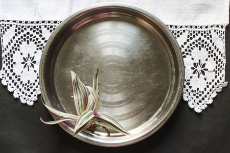 old rectangular metal tray and antique silverware on a black background of natural sunlight, shadow. kitchen table top view, table setting. Nice retro, rustic background, free space.