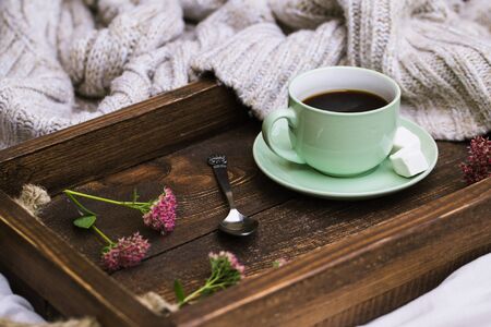Cup of coffee and candle on rustic wooden serving tray and knitting warm woolen sweater