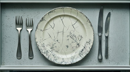 A beautifully cracked porcelain plate sits at the center of a minimalist dining table, surrounded by vintage silverware, creating an artful yet elegant dining scene.