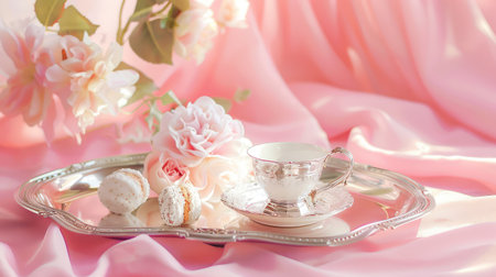 Vintage wooden tray with porcelain teacup and pink flowers on shabby chic mint background
