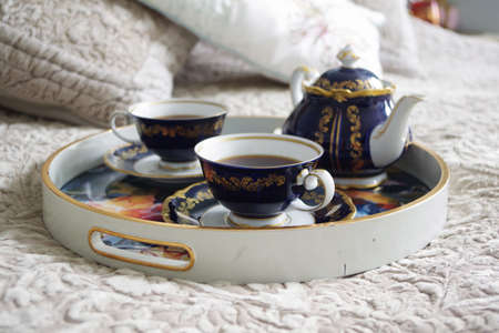 A eucalyptus branch lies on a white sheet beside a tray with a cup of tea and a saucer in a letter in an envelope. The garland is glowing. Copy space. Place for text.