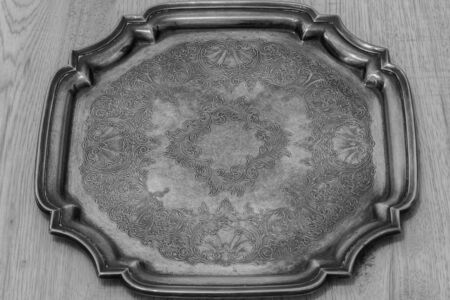 Antique tarnished silver tray with engraved pattern on a grey wood background
