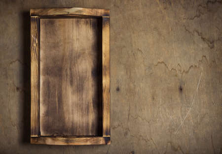 Handmade burned box on a wooden rustic texture for background. Rough weathered wooden board. Toned.