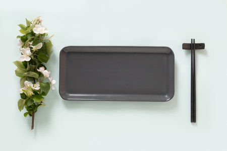 Empty rectangular gray plate for Asian food with black chopsticks on blue background surface with spring branches. Asian style. View from above. Copy space. Japanese food concept.