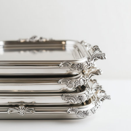 A collection of beautifully crafted silver serving trays stacked neatly, highlighting intricate designs and a polished finish. Ideal for formal events or display in a stylish home.