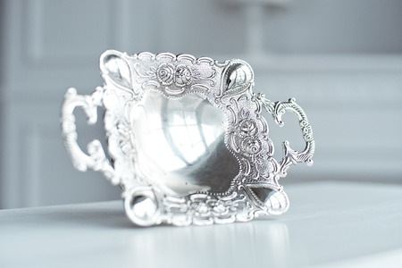 A close-up view displays a hand holding a highly detailed silver serving tray. The tray features intricate patterns and reflects light, contrasting with the dark background. The lighting highlights the textures and shapes, suggesting a formal or luxurious setting, suitable for visual content and stock photography.