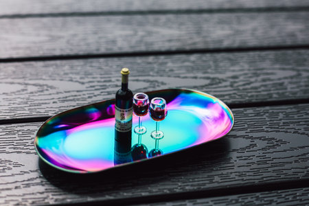 A miniature wine setup on an iridescent tray creates a stylish scene with reflection. A bottle of red wine and glasses are arranged on an iridescent tray atop a dark wooden surface. Party time.