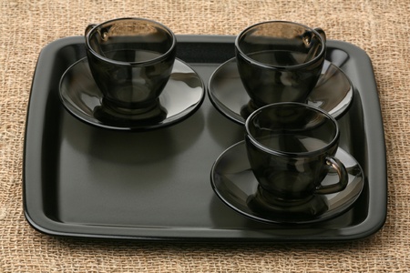 Arabic Lebanese black coffee cup on wooden tray with flower plant | Top view shot