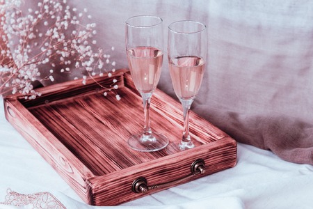 A wooden serving tray holds a glass of champagne, a fresh fig, a bunch of red grapes, and a gift tag that reads 'Cheers to You!'. The arrangement suggests a celebratory welcome amenity or a relaxing treat in a hotel or home setting.