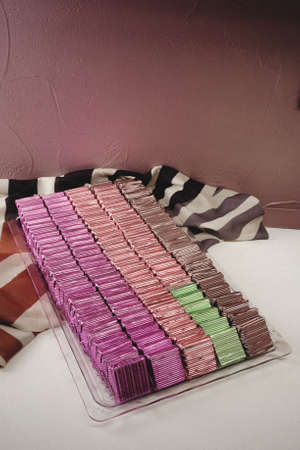 Colorful abstract art resin trays displayed on wooden table in artistic studio. That the image is generated using AI.