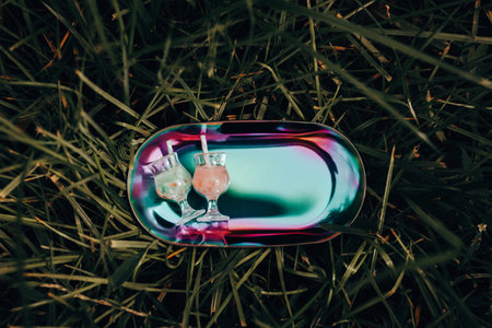 Two refreshing cocktails on a tray, resting on a bed of green grass. Colorful cocktails with straws sit on a metallic tray amid green grass. Summertime party fun in hot day.