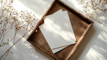A captivating setup featuring two wooden trays with empty cards surrounded by delicate white flowers, perfect for invitations or notes.