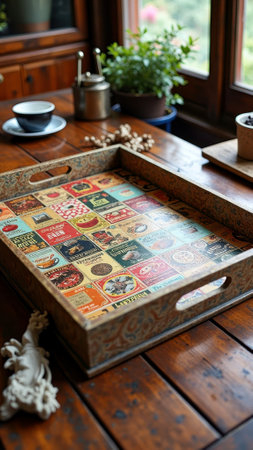 Vintage tin label tray on wooden table with warm natural light. That the image is generated using AI.