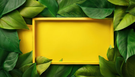 Green leaves and yellow frame with space for text on white background, top view