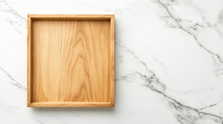 A simple wooden tray sits on a marble surface, perfect for showcasing culinary delights or decorative items. Ideal for minimal and modern presentations.