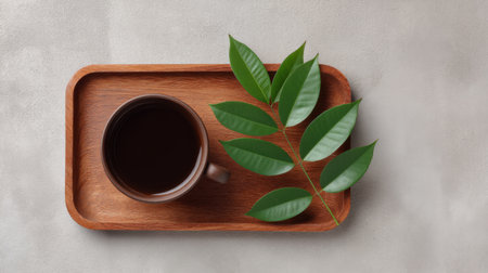Enjoy a minimalistic flat lay of a warm cup of coffee placed on a wooden tray with a glossy green leaf, evoking a cozy and inviting ambiance in any space.