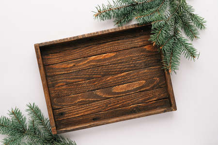 Christmas or winter mock-up scene. old wooden tray and green fir branch on White background. Flat lay, top view. minimalist concept. christmas concept
