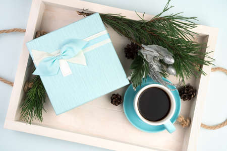 Gift box with a Cup of coffee Christmas balls and a spruce branch on a white tray. Holiday background, top view. The concept of the new year 2021 and Christmas.